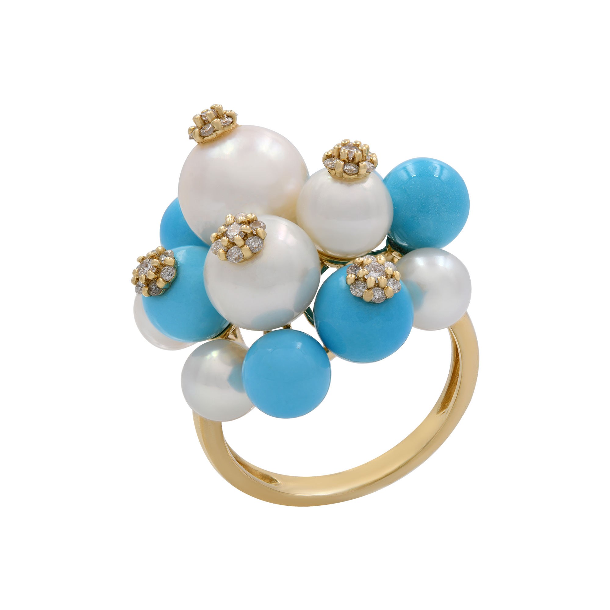 PERLA - Fai Po 14K Yellow Gold Turquoise and Fresh Water Pearl with White Diamond Ring, 22.166 TCW