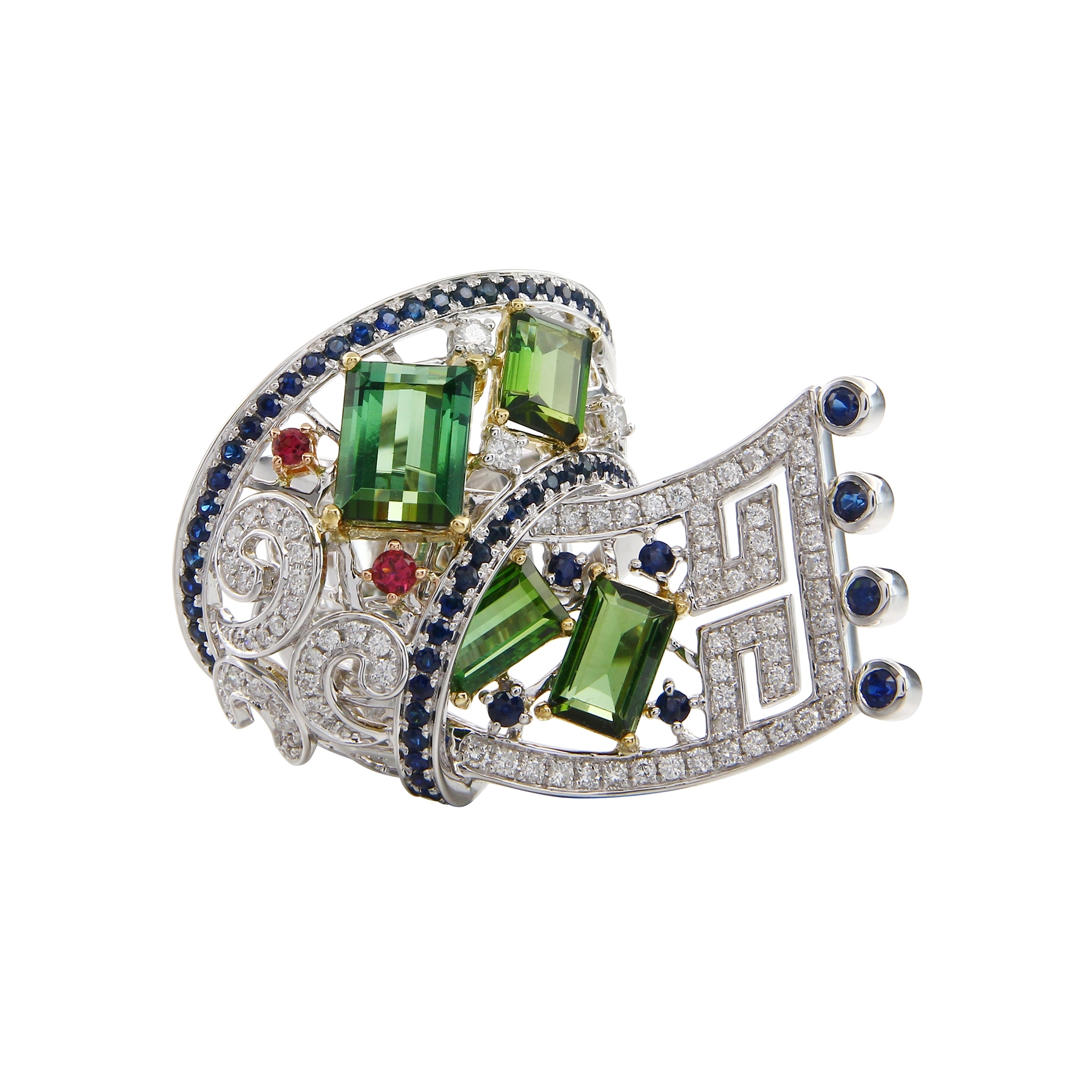 Green Tourmaline, Tourmaline, Blue Sapphire Ring with White Diamond, 8.111 TCW